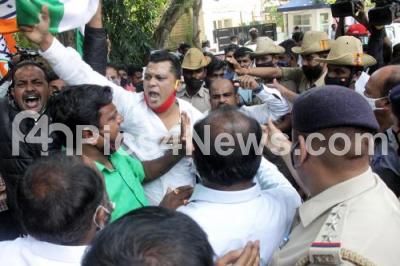 Congress party workers raise slogans during a protest against CBI raids at the residence of KPCC President DK Shivakumar, in Bengaluru on Monday 5th October 2020