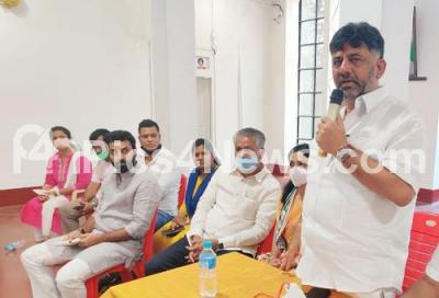 Photo Caption : KPCC President DK Shivakumar addressing the Congress leaders and workers during a meeting on Rajarajeshwari Nagar constituency by-election, in Bengaluru on Thursday 8th October 2020