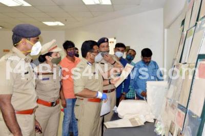 Photo Caption : Police officials inspects the seized fake stamp paper which were seized by SJ Park Police Station Halasurugate Subdivision Central Division police during a press conference, in Bengaluru on Saturday 10th October 2020