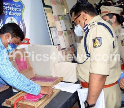 Photo Caption : Police officials inspects the seized fake stamp paper which were seized by SJ Park Police Station Halasurugate Subdivision Central Division police during a press conference, in Bengaluru on Saturday 10th October 2020