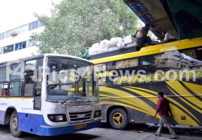 Photo Caption : A bus carrying luggage got stuck under a flyover over, which is under construction at Shivananda Circle, in Bengaluru on Sunday 11th Ocotober 2020