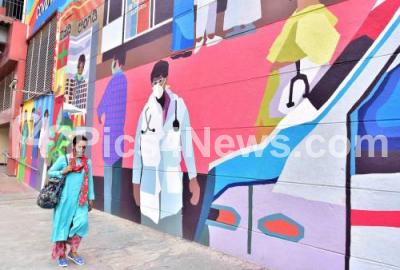Photo Caption : People pass through the graffiti art to create awareness among people on Covid-19 at Old Madras Road, in Bengaluru on Monday 12th October 2020
