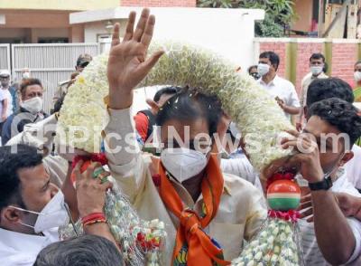 Photo Caption : Raja Rajeshwari Nagar BJP candidate Muniratna arriving with supporters to file his nomination paper for the Raja Rajeshwari Nagar bye-election at RR Nagar, in Bengaluru on Wednesday 14th October 2020
