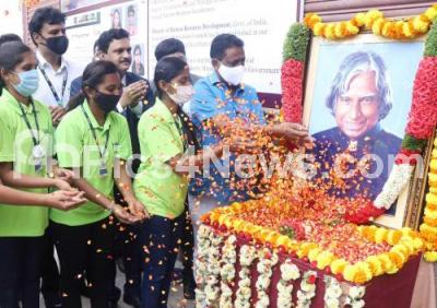 Photo Caption : Students from Sri Leo Muthu Innovation Centre of Sri Sairam College of Engineering and Former Councilor Nagaraju paying floral tribute to the portrait of Former President Dr APJ Abdul Kalam during his birth anniversary and National Innovation Day at Jayanagar, in Bengaluru on Thursday 15th October 2020