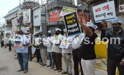 Event Description : Aam Aadmi Party members staged a protest against the Smart City projects which are stalled across Bengaluru City, the protest was held at Kamaraj Road near Commercial Street, in Bengaluru on Thursday 15th October 2020
