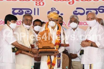 Photo Caption : Dr CN Manjunath, Cardiologist and Director, Sri Jayadeva Institute of Cardiovascular Sciences and Research, Bengaluru, being felicitated by CM BS Yediyurappa and MLAs GT Devegowda and SA Ramadas during the inauguration of the Dasara 2020 floral tributes to Goddess Chamundeshwari at Chamundi Hills, in Mysuru on Saturday 17th October 2020