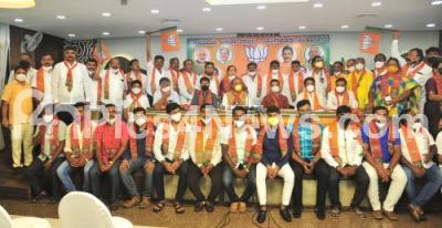 Photo Caption : Former Congress Councilors and congress workers joined BJP party in the presence of BJP State President Nalin Kumar Kateel, also seen are Ministers R Ashok, CT Ravi, MLA Arvind Limbavali and Rajarajeshwari Assembly constituency candidate Munirathna during a Rajarajeshwari Assembly bye-poll meeting at a private hotel, in Bengaluru on Sunday 18th October 2020