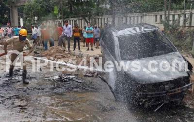 Photo Caption : Fireman seen putting off the car fire on the busy Nayandahalli Road, in Bengaluru on Sunday 18th October 2020