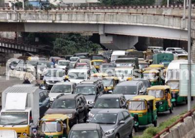 Photo Caption : Traffic jam reported at Okalipuram junction, in Bengaluru on Monday 19th October 2020