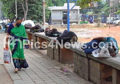 Photo Caption : Homeless people napping on the stone benches at Bannappa Park, in Bengaluru on Tuesday 20th October 2020