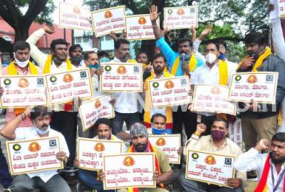 Photo Caption : Members of Karnataka Chalakara Okkuta protesting to fulfill their various demands at SBM Circle, in Bengaluru on Thursday 22nd October 2020