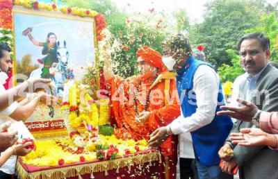 Photo Caption : S Rangappa, Director, Kannada and Culture Dept with Sri Jaya Basava Mrityunjaya and others paying floral tribute to Kittur Rani Chennamma idol during her Jayantotsava at Ravindra Kalakshetra Premises, in Bengaluru on Friday 23rd October 2020