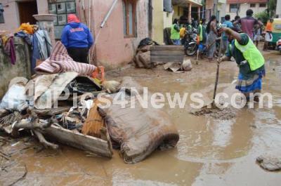 Photo Caption : BBMP workers cleaning rainwater logged roads after many homes were flooded at Dattatreya Layout, Hosakerehalli due to yesterdays heavy rainfall, in Bengaluru on Saturday 24th October 2020