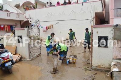 BBMP workers cleaning rainwater logged roads after many homes were flooded at Dattatreya Layout, Hosakerehalli due to yesterdays heavy rainfall, in Bengaluru on Saturday 24th October 2020