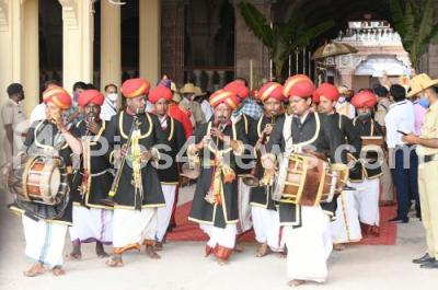 Photo Caption : Nadaswara artistes seen during the Vijayadashami celebration procession at Mysuru palace , in Mysuru on Monday 26th October 2020