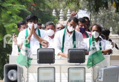 Photo Caption : JDS Leaders Nikhil Kumarswamy with TA Sharavana and others campaigning for Rajarajeshwari JDS candidate Krishna Murthy during Rajarajeshwari Nagar bye poll , in Bengaluru on Tuesday 27th October 2020