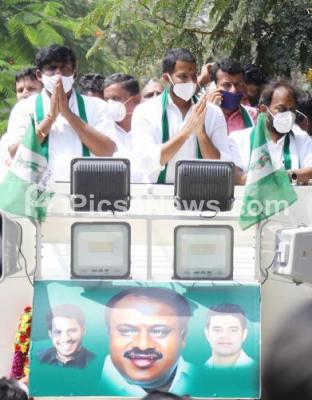 Photo Caption : JDS Leaders Nikhil Kumarswamy with TA Sharavana and others campaigning for Rajarajeshwari JDS candidate Krishna Murthy during Rajarajeshwari Nagar bye poll , in Bengaluru on Tuesday 27th October 2020