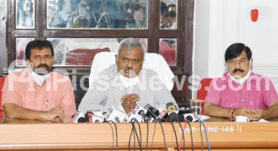 Photo Caption : Minister ST Somashekhar addressing a press conference with MLA SA Ramdas and MP Pratap Simha, in Mysuru on Tuesday 27th October 2020