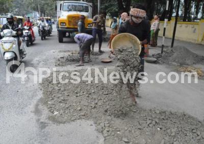 Photo Caption : Potholes being filled by workers at KH Road, in Bengaluru on Thursday 29th October 2020
