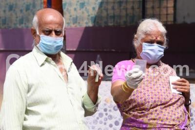 Photo Caption : An elder couple standing in the queue to cast their vote for the Rajarajeshwari Nagar bypoll at Ullal Voting centre, in Bengaluru on Tuesday 3rd November 2020