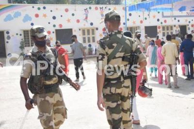 Photo Caption : Tight security at voting centre during Rajarajeshwari Nagar bypoll, in Bengaluru on Tuesday 3rd November 2020