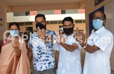People display their marked fingers after casting their vote for the Rajarajeshwari Nagar bypoll, in Bengaluru on Tuesday 3rd November 2020