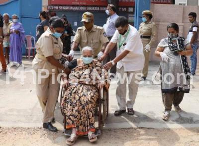 Photo Caption : An elder woman arriving on a wheelchair to cast her vote for the Rajarajeshwari Nagar bypoll, in Bengaluru on Tuesday 3rd November 2020
