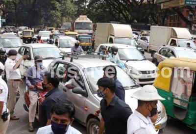 Photo Caption : Traffic jam at SBM circle due to Karnataka State Farmers Association protest, in Bengaluru on Thursday 5th November 2020