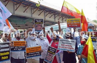 Members of Aam Aadmi Party protesting against the delaying of steel bridge work progress at Shivananda Circle, in Bengaluru on Friday 6th November 2020
