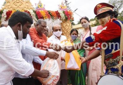 Photo Caption : Actress Sudharani and Film Director Govind Raju distributed Bandset food kits and other items to Band set teams, who were affected by the Covid-19 pandemic, sponsored by Shree Krishna SEVA Sangha, in Bengaluru on Sunday 8th November 2020