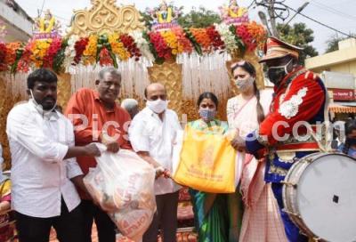Event Description : Actress Sudharani and Film Director Govind Raju distributed Bandset food kits and other items to Band set teams, who were affected by the Covid-19 pandemic, sponsored by Shree Krishna SEVA Sangha, in Bengaluru on Sunday 8th November 2020