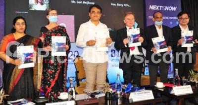 DCM Ashwath Narayan with Jette Bjerrum, Consul General of Denmark, Jeremy Pilmore Bedford, UK Deputy High Commissioner and others releasing a brochure during a press conference on “Bengaluru Tech Summit 2020” at a private hotel, in Bengaluru on Monday 9th November 2020