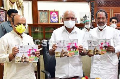 Photo Caption : CM BS Yediyurappa releasing one year achievements of veterinary dept of Karnataka, also seen are Home Minister Basavaraj Bommai, Ministers Prabhu Chauhan and V Somanna, in Bengaluru on Thursday 12th November 2020