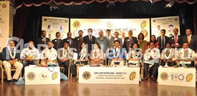 Photo Caption : Lions Media Awardees with Dr. CN Manjunath, Director, Sri Jayadeva Institute of Cardiovascular Sciences and Research, MB Deepak, District Governor - 317F and others during National Journalism Day 2020 program organised by Lions Clubs International - District 317F at Bharatiya Vidya Bhavan, in Bengaluru on Tuesday 17th November 2020
