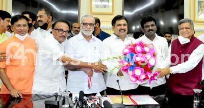 Photo Caption : Newly elected MLCs Chidananda M Gowda, Shashil G Namoshi, Sankanura and Puttanna being greeted by Prathap Chandra Shetty, Chairman of Karnataka Legislative Council and Minister Jagadish Shettar during their swearing ceremony at Vidhana Soudha, in Bengaluru on Thursday 19th November 2020