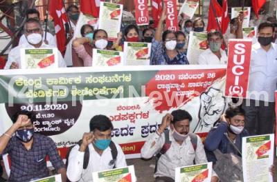 Members of SUCI staging a protest at SBM Circle to press their various demands, in Bengaluru on Friday 20th November 2020