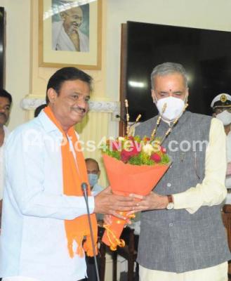 Photo Caption : Newly elected Rajarajeshwari Nagar MLA Muniratna being greeted by Speaker Vishweshwar Hegde Kageri during MLA oath taking ceremony at Vidhana Soudha, in Bengaluru on Monday 23rd November 2020