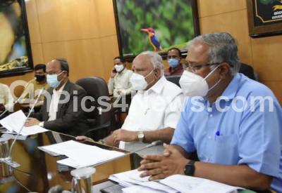 Photo Caption : CM BS Yediyurappa and Education Minister S Suresh Kumar and Chief Secretary Vijaya Bhaskar during a meeting on School reopen, in Bengaluru on Monday 23rd November 2020