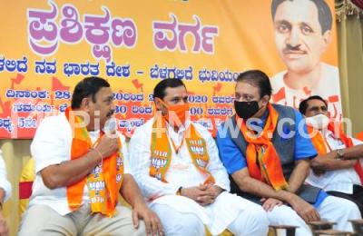 Photo Caption : BJP MLAs Uday Garudachar, Ravi Subramanya and others seen at the BJP South Bangalore Region meeting , in Bengaluru on Saturday 28th November 2020