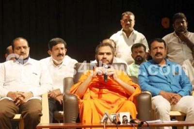 Nanjavudutha Swamiji of Gurukunda Brahmeswara Mutt with State vokkaligara okkuta leaders during a press conference on implementation to vokkaliga community at Kuvempu Kalakshetra, in Bengaluru on Saturday 28th November 2020