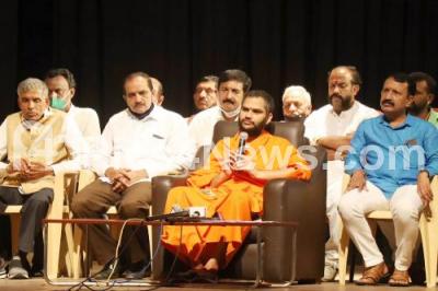 Photo Caption : Nanjavudutha Swamiji of Gurukunda Brahmeswara Mutt with State vokkaligara okkuta leaders during a press conference on implementation to vokkaliga community at Kuvempu Kalakshetra, in Bengaluru on Saturday 28th November 2020