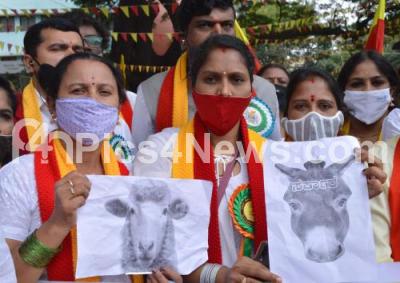 Photo Caption : Members of Kannada organisations and Kannada Activists protesting against state governments decision to form Maratha Development Authority, in Bengaluru on Friday 4th December 2020