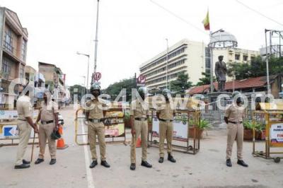 Tight police security at Malleshwaram Main Road, as Pro Kannada outfits called for Karnataka Bandh, in protest against the state governments move to set up Maratha Development Authority (MDA) , in Bengaluru on Saturday 5th December 2020