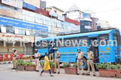 Photo Caption : Tight police security at Malleshwaram Main Road, as Pro Kannada outfits called for Karnataka Bandh, in protest against the state governments move to set up Maratha Development Authority (MDA) , in Bengaluru on Saturday 5th December 2020