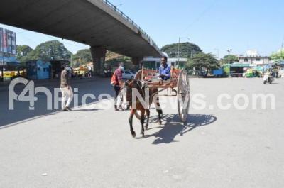 Photo Caption : People using horse cart following BMTC and KSRTC employees strike to press their various demands, in Bengaluru on Friday 11th December 2020