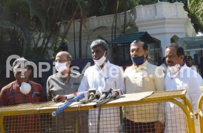 Photo Caption : Minister Kota Srinivas Poojary and BJP MLCs addressing media at Rajbhavan after meeting Governor Vajubhai Vala, in Bengaluru on Friday 11th December 2020