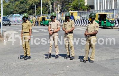 Photo Caption : Police security at Majestic bus stand during a strike called by BMTC and KSRTC employees demanding permanent jobs in KSRTC and BMTC, in Bengaluru on Saturday 12th December 2020