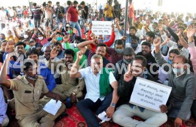 Photo Caption : BMTC and KSRTC employees led by Farmer Leader Kodihalli Chandrashekar raise slogans against the state government demanding permanent jobs, in Bengaluru on Sunday 13th December 2020
