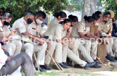 Police personnel seen during BMTC and KSRTC employees protest at Freedom Park, in Bengaluru on Sunday 13th December 2020