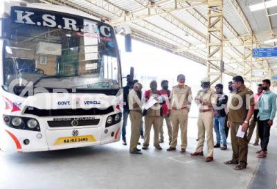 Photo Caption : KSRTC buses resume public service with Police personnel security at Majestic bus terminal during BMTC and KSRTC employees protest against the state government demanding permanent jobs, in Bengaluru on Sunday 13th December 2020